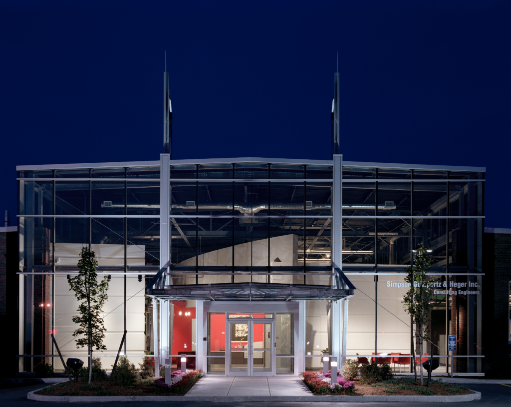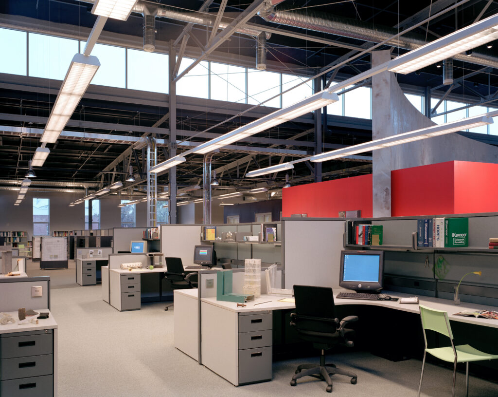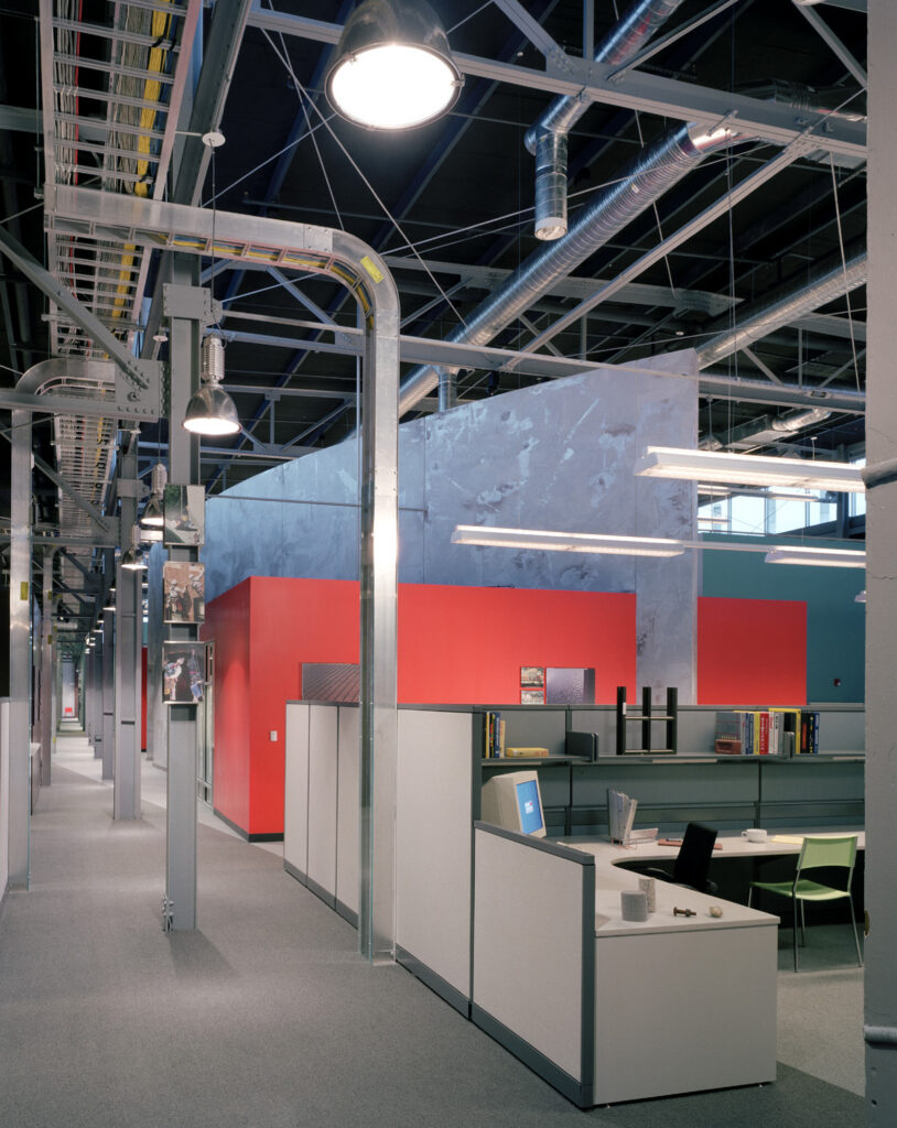 Simpson Gumpertz and Heger Inc. (SGH) is an internationally renowned structural engineering firm specializing in structural design, forensic analysis of structures, and development of building technologies. After 20 years in a typical office environment they decided to move their headquarters to a reclaimed industrial building – a space where they could develop the idiosyncrasies of their corporate identity. The space, typical of many industrial buildings, was three bays wide with the central bay having a higher (30’) roof to allow for clerestory lighting.
