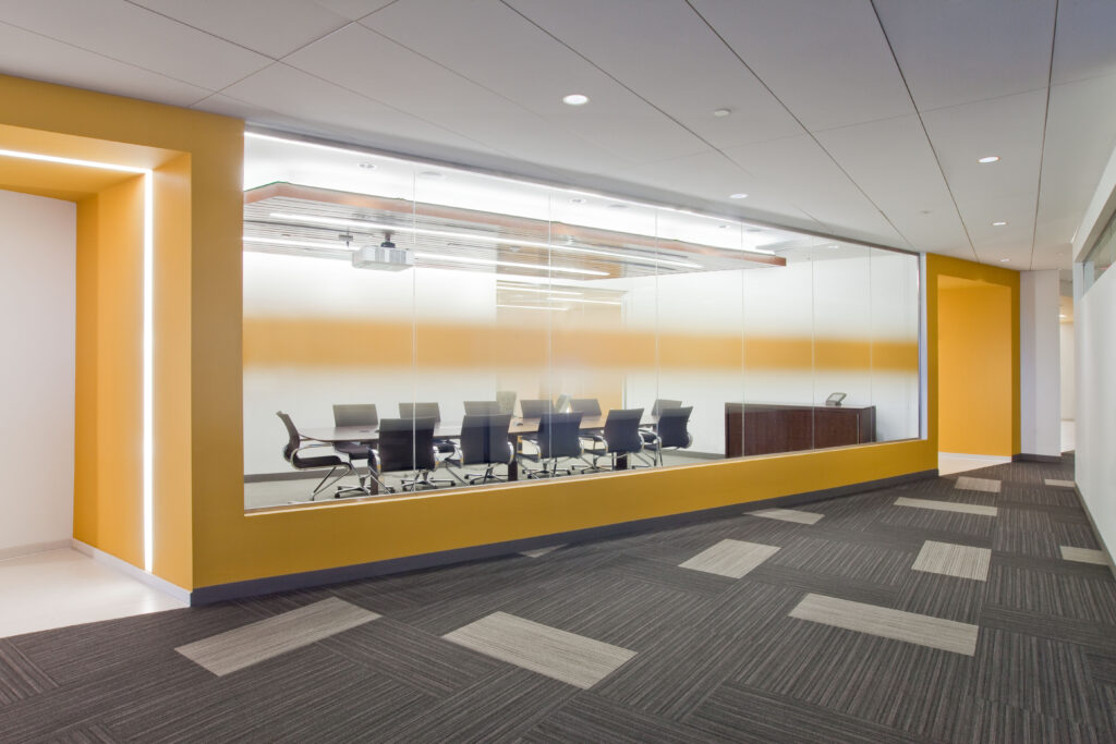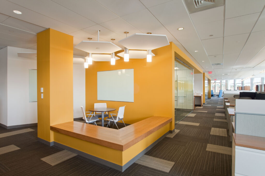 The approach to the open office area was clear from the start. In accordance with LEED principals, closed offices and meeting rooms were to be located on the interior of the floor plate, thus maximizing daylight and access to views for all. In order to meet the programmatic requirements, “pods” were created throughout the space. The pods float among a landscape of open work stations and house a variety of functions from touchdown areas to private offices. The vocabulary of the pods is an adaptation and extension of the concepts established in the ribbon.