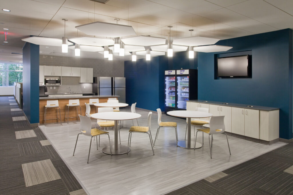 The project occupies two levels, at 30,000 square feet per floor. The new space is entered on the upper floor, where a central organizing element, the “ribbon” bisects the space. The ribbon is an architectural feature that creates space to gather in, both formally and informally, and circulate through. The ribbon’s geometry is emphasized through the thickening of the walls and ceiling soffits to create the appearance of gateways and archways throughout the space, which were painted bold colors drawing from the SAP branding palette.